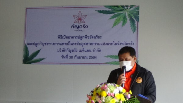 ที่อาคารปลูกพืชอัจฉริยะ บริษัท กัญตรัง เมดิแคน จำกัด ตำบลบางรัก อำเภอเมืองตรัง จังหวัดตรัง นายภูวนัฐ สมใจ รองผู้ว่าราชการจังหวัดตรัง เป็นประธานในพิธีเปิดอาคารปลูกพืชอัจฉริยะและกิจกรรมปลูกกัญชงทางการแพทย์ในระดับอุตสาหกรรม โดยมีนายแพทย์บรรเจิด สุขพิพัฒปานนท์ นายแพทย์สาธารณสุขจังหวัดตรัง, นายประชา งามรัตนกุล ประธานสภาอุตสาหกรรม จังหวัดตรัง, นายจารึก ทองหนัน รองนายก อบจ.ตรัง,ตัวแทนจากหอการค้าจังหวัดตรัง ทั้งนี้นายแพทย์สมชัย เจียรนัยศิลป์ ประธานกรรมการบริษัท กัญตรัง เมดิแคน จำกัด กล่าวว่า เนื่องจากปัจจุบันประเทศไทยได้มีการแก้ไขกฎหมายพระราชบัญญัติยาเสพติดให้โทษ พ.ศ.2522 โดยให้บางส่วนของพืชกัญชงและกัญชาไม่เป็นยาเสพติดให้โทษ ในประเภท 5 และรัฐบาลได้มีการสนับสนุนให้ปลูกพืชกัญชงเป็นพืชเศรษฐกิจชนิดใหม่ของประเทศไทย อีกทั้งในปัจจุบันได้มีการศึกษาพบว่าสาร CBD (cannabidiol) ซึ่งเป็นสาระสำคัญที่สามารถพบได้มากในช่อดอกกัญชงนั้นมีคุณค่าทางการแพทย์ที่ไม่มีฤทธิ์กระตุ้นระบบประสาทไม่ทำให้ผู้ป่วยอยากอาการ ลดความวิตกกังวลช่วยให้หลับดีขึ้นบรรเทาการเกร็งของกล้ามเนื้อ กันชัก ลดการอักเสบและระงับอาการคลื่นไส้และอาเจียน และมีมูลค่าทางการตลาดสูงมากในตลาดโลกกว่า 1 แสนล้านบาท จึงได้เล็งเห็นถึงความสำคัญและประโยชน์ของพืชกัญชงและกัญชา โดยเฉพาะอย่างยิ่งคุณประโยชน์ทางการแพทย์และช่วยผลักดันเศรษฐกิจของไทย เพื่อเป็นพืชเศรษฐกิจตัวใหม่ทดแทนยางพาราที่ราคาตกต่ำ