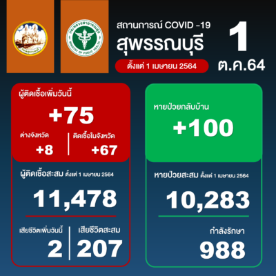 สำหรับสถานการณ์โรค COVID-19 จังหวัดสุพรรณบุรี วันนี้มีผู้ติดเชื้อ 75 ราย รวมยอดจำนวนที่พบเชื้อสะสมระรอกใหม่ตั้งแต่ 1 เมษายน 2564 ถึงปัจจุบัน 11,478ราย และรักษาหายแล้ว 10,283 ราย คงเหลือกำลังรักษาอีก 988 ราย มีเสียชีวิตเพิ่มวันนี้ 2 ราย เสียชีวิตสะสม 207 ราย และรักษาหายแล้วกลับบ้าน 100 คน