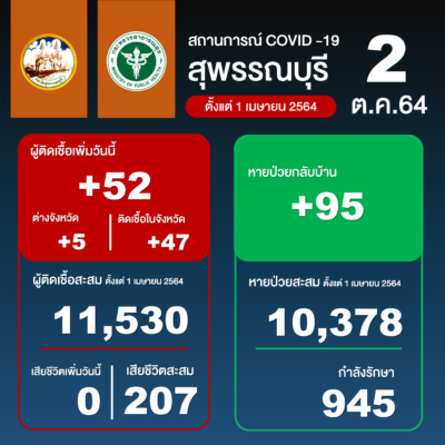 สำหรับสถานการณ์โรค COVID-19 จังหวัดสุพรรณบุรี วันนี้มีผู้ติดเชื้อ 52 ราย รวมยอดจำนวนที่พบเชื้อสะสมระรอกใหม่ตั้งแต่ 1 เมษายน 2564 ถึงปัจจุบัน 11,530 ราย และรักษาหายแล้ว 10,378 ราย คงเหลือกำลังรักษาอีก 945 ราย ไม่มีเสียชีวิตเพิ่มวันนี้ เสียชีวิตสะสม 207 ราย และรักษาหายแล้วกลับบ้าน 95 คน