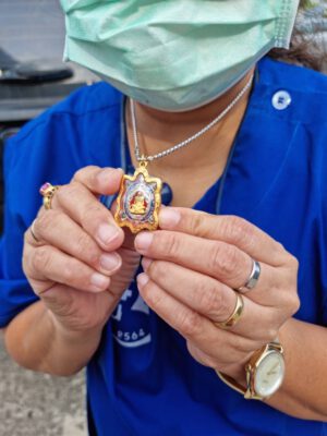 ผู้สื่อข่าวได้สอบถามต่อว่ามีของดีอะไร หรือห้อยพระอะไรที่คอ ทางรองผู้อำนวยการฯสาวเล่าต่ออีกว่า รถตนเองมีหลวงพ่อวัดไร่ขิงจำลองขนาดสามนิ้วตั้งอยู่หน้ารถ และ ที่คอตนเองได้ห้อยพระเหรียญพญาเต่าเรือนหลวงพ่อพูล วัดไผ่ล้อม เลี่ยมทอง ที่เมื่อสองวันก่อน พระครูปลัดสิทธิวัฒน์ หลวงพี่น้ำฝน เจ้าอาวาสวัดไผ่ล้อม และคณะศิษย์มามอบข้าวจำนวน500กล่องให้บุคลากรโรงพยาบาลสามพราน พร้อมกับได้มอบพระเหรียญพญาเต่าเรือนหลวงพ่อพูล วัดไผ่ล้อม องค์นี้พร้อมโชว์ให้ผู้สื่อข่าวดู เพื่อเป็นขวัญกำลังใจในการทำงาน ซึ่งหลวงพี่ได้ ให้พร ว่า “ขอให้มีโชคมีชัย เดินทางไปไหนขอให้ปลอดภัย เป็นคนดีช่วยเหลือผู้อื่นแบบนี้ตลอดไปนะ” ตนจึงเชื่อว่าเป็นเพราะบารมีเหรียญพญาเต่าเรือนหลวงพ่อพูล วัดไผ่ล้อม ที่เพิ่งได้รับมา จากหลวงพี่น้ำฝนรวมทั้งหลังเกิดเหตุได้โทรศัพท์บอกหลวงพี่น้ำฝน ขอบพระคุณที่ได้รับพรจากหลวงพี่น้ำฝน ในวันนั้นจึงรอดปลอดภัยมาทั้งแม่และลูกในครั้งนี้ด้วย หลวงพี่น้ำฝนท่านได้บอกว่าโยมทำดีช่วยเหลือผู้อื่น สิ่งศักดิ์สิทธิ์ เทวดาทั้งหลายท่าน ย่อมปกปักรักษาคนที่ทำความดีอย่างแน่นอน อีกอย่างหลังจากเรื่องร้ายๆผ่านไปตนก็ยังได้ข่าวดีว่ามีโชคงวดนี้อีกด้วย รองผู้อำนวยการฯสาวกล่าวไว้