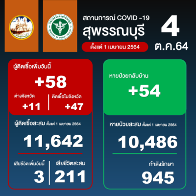 สำหรับสถานการณ์โรค COVID-19 จังหวัดสุพรรณบุรี วันนี้มีผู้ติดเชื้อ 58 ราย รวมยอดจำนวนที่พบเชื้อสะสมระรอกใหม่ตั้งแต่ 1 เมษายน 2564 ถึงปัจจุบัน 11,642 ราย และรักษาหายแล้ว 10,486 ราย คงเหลือกำลังรักษาอีก 945 ราย มีเสียชีวิตเพิ่มวันนี้ 3 ราย เสียชีวิตสะสม 211 ราย และรักษาหายแล้วกลับบ้าน 54 คน