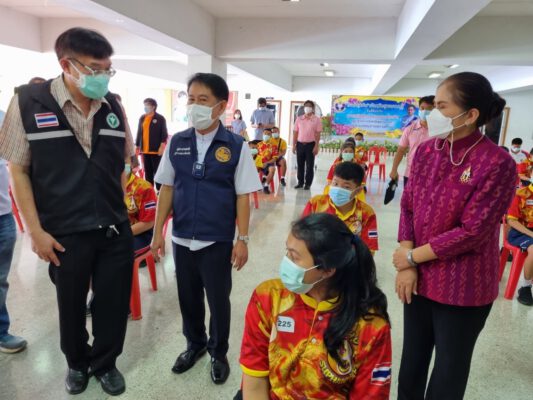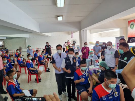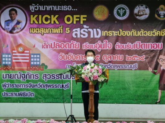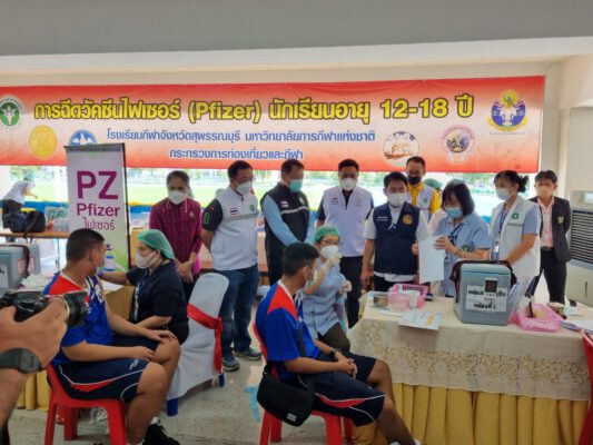 วันนี้(5 ต.ค.64) เวลา 10.30 น.นายณัฐภัทร สุวรรณประทีป ผู้ว่าราชการจังหวัดสุพรรณบุรี ตรวจเยี่ยมให้กำลังใจทีมแพทย์พยาบาล และนักเรียนโรงเรียนกีฬาจังหวัดสุพรรณบุรี ในการ Kick Off การฉีดวัคซีนไฟเซอร์ แก่นักเรียนอายุ 12-18 ปีที่ผู้ปกครองอนุญาต ภายใต้แนวคิด “สร้างเกราะป้องกันด้วยวัคซีน เด็กปลอดภัย เรียนอุ่นใจ ต้อนรับเปิดเทอม” ณ โรงเรียนกีฬาจังหวัดสุพรรณบุรี