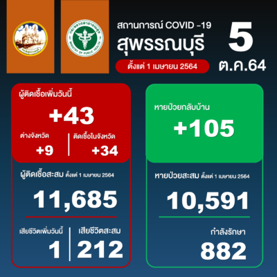 สำหรับสถานการณ์โรค COVID-19 จังหวัดสุพรรณบุรี วันนี้มีผู้ติดเชื้อ 43 ราย รวมยอดจำนวนที่พบเชื้อสะสมระรอกใหม่ตั้งแต่ 1 เมษายน 2564 ถึงปัจจุบัน 11,685 ราย และรักษาหายแล้ว 10,591 ราย คงเหลือกำลังรักษาอีก 882 ราย มีเสียชีวิตเพิ่มวันนี้ 1 ราย เสียชีวิตสะสม 212 ราย และรักษาหายแล้วกลับบ้าน 105