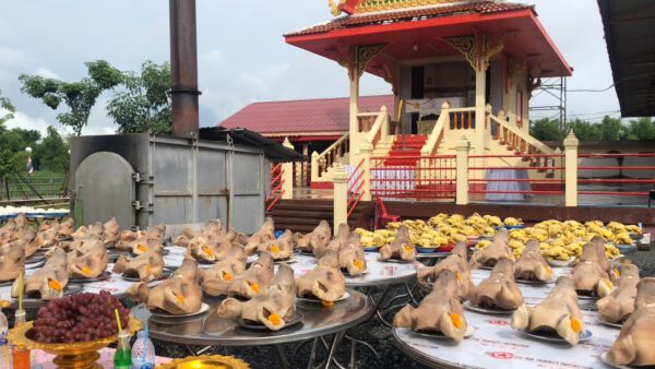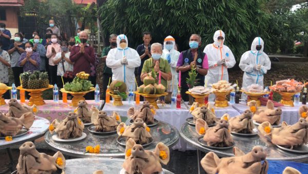 วันนี้(6 ต.ค.64) เมื่อเวลา 09.09 น. ที่วัดเถรพลาย ต.วังน้ำซับ อ.ศรีประจันต์ จ.สุพรรณบุรี ได้มีพิธีถวายสังฆทาน อุทิศส่วนบุญส่วนกุศลให้แก่ผู้เสียชีวิตจากโควิด19 ที่ได้มาบำเพ็ญกุศล ฌาปนกิจศพที่เมรุสถานชั่วคราว ของทางวัด และทำบุญเนื่องในเทศกาลวันสารทไทย จึงประกอบพิธีเซ่นไหว้ผีบรรพบุรุษปู่ ย่า ตา ยาย โดยจัดเครื่องบวงสรวงเซ่นไหว้ ประกอบด้วยไก่ต้ม 99 ตัว หัวหมู่ 99 หัว ไข่ต้ม 999 ฟอง ผลไม้ 9 อย่าง และ ขนม 9 ชนิด