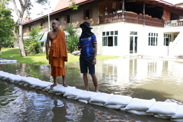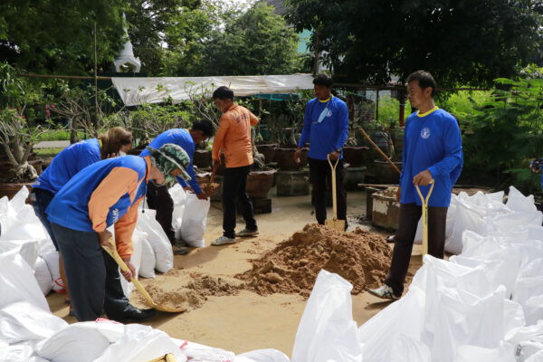 นำเจ้าหน้าที่กองช่างฯ ร่วมกับชาวบ้านตำบลทับตีเหล็ก ดำเนินการกรอกกระสอบทรายวางแนวกั้น