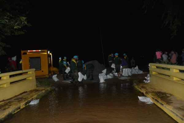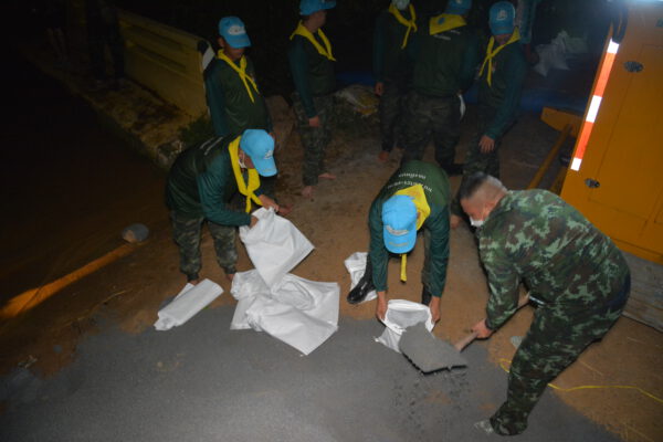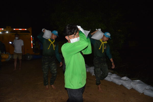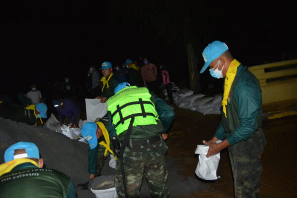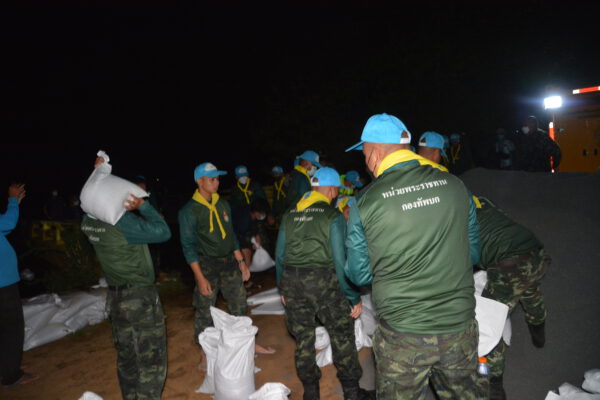 ได้นำกำลังพลจิตอาสา กองพันซ่อมบำรุง กรมสนับสนุน กองพลทหารราบที่ 9 จ.กาญจนบุรี จำนวน 40 นาย กำนัน ผู้ใหญ่บ้าน เจ้าหน้าที่ฝ่ายปกครอง และชาวบ้าน เร่งบรรจุกระสอบทราย