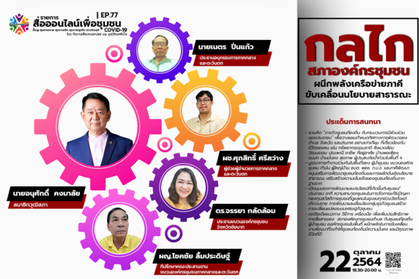 อาจารย์กิติ จารุอารยนันท์ ประธานสถาบันพัฒนาธุรกิจภูมิภาค เปิดเผยว่าสถาบันพัฒนาธุรกิจภูมิภาค โดย มูลนิธิองค์กรเครือข่ายบริการธุรกิจภูมิภาค ได้ออกแบบ และจัดทำรายการสื่อออนไลน์เพื่อชุมชนขึ้น ทุกวันศุกร์ เวลา 18.30 – 20.00 น. เพื่อให้ประชาชนทุกภาคส่วนได้รับรู้ข่าวสาร และแนวทางในการรับมือ แก้ปัญหา เพื่อการดำรงชีวิตอย่างมีความสุข และยั่งยืน โดยในวันที่ 22 ตุลาคม 2564 ในประเด็น “กลไกสภาองค์กรชุมชน…ผนึกพลังเครือข่ายภาคีขับเคลื่อนนโยบายสาธารณะ” หัวข้อสนทนา- ชวนคิด “ภารกิจชุมชนท้องถิ่น กับกระบวนการมีส่วนร่วมของประชาชน” เพื่อวางแผนกำหนดทิศทางการพัฒนาของตำบล จังหวัด และประเทศ อย่างเท่าเทียม ที่เกี่ยวข้องกับชีวิตของคน เช่นทรัพยากรธรรมชาติ สิ่งแวดล้อม วัฒนธรรม ประเพณี อาชีพ ที่อยู่อาศัย บ้านพอเพียงชนบท บ้านมั่นคง สุขภาพ ผู้ประสบภัยน้ำท่วมในพื้นที่ ฯ- บูรณาการทำงานร่วมกันในพื้นที่ของ ผู้นำชุมชน ขบวนองค์กรชุมชน กำนัน ผู้ใหญ่บ้าน อบต. พอช. ก.บ.จ. และภาคีพัฒนา หนุนเสริมการพัฒนาชุมชนท้องถิ่นและการผลักดันเชิงนโยบายสาธารณะ เสริมสร้างความเข้มแข็งของชุมชนท้องถิ่นจากฐานราก- เปิดมุมมองการพัฒนาและประโยชน์ที่เกิดขึ้นกับชุมชน/ประชาชน อาทิ ความสามารถชุมชนในการจัดการแก้ไขปัญหา กองทุนสวัสดิการชุมชนที่ดูแลคนในชุมชนทุกช่วงวัยตั้งแต่เกิดจนตาย การพัฒนาและเชื่อมโยงกลุ่มธุรกิจชุมชนสร้างการเปลี่ยนแปลงระบบเศรษฐกิจชุมชน – แชร์ไอเดียแนวทาง วิธีการ เครื่องมือ เพื่อเพิ่มประสิทธิภาพการสื่อสารของ สภาองค์องกรชุมชนตำบล กับชุมชนท้องถิ่น ผู้นำชุมชน องค์กรชุมชนในพื้นที่ ผนึกพลังในการขับเคลื่อนงานพัฒนาที่จะทำให้ชุมชนท้องถิ่นมีความมั่นคง และมีคุณภาพชีวิตที่ดี