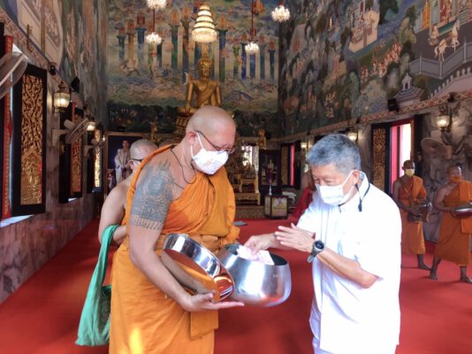 ซึ่งในพิธี พระครูปลัดสิทธิวัฒน์ หลวงพี่น้ำฝน เจ้าอาวาสวัดไผ่ล้อม ได้นำคณะสงฆ์ สวดเจริญพระพุทธมนต์ บูชาพระรัตนตรัยในพระอุโบสถ จากนั้นเดินลงจากพระอุโบสถ เพื่อรับบิณฑบาตร ที่มีญาติโยม พุทธศาสนิชกชน ตั้งโต๊ะเพื่อใส่บาตร ข้าวสาร อาหาร แห้ง และปัจจัย เพื่อเป็นการร่วมบุญวันสำคัญทางพระพุทธศาสนา โดยวัดไผ่ล้อมได้จัดขึ้นเป็นประจำทุกปี และปีนี้มีการจัดโต๊ะที่แยกเว้นระยะห่างกัน รวมทั้งวัดไผ่ล้อมได้มีการถ่ายทอดสดผ่านเฟซบุ๊ก เพื่อให้ลูกศิษย์ได้ร่วมกันอนุโมทนาและรับพรที่บ้านได้โดยไม่ต้องมาที่วัด เพื่อสืบสานวัฒนธรรมประเพณีของชาวพุทธที่สืบสานต่อกันมาอย่างยาวนานอีกด้วย