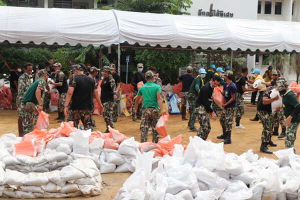 โดยที่บริเวณด้านหน้าของ รพ.เจ้าพระยายมราช ได้มี เจ้าหน้าที่ รพ. และ เจ้าหน้าที่จากหน่วยพิทักษ์อุทยานแห่งชาติ พุเตย กระทรวงทรัพยากรธรรมชาติและสิ่งแวดล้อม และจิตอาสาจากอีกหลายหน่วยงาน ได้เข้ามาช่วยกันกรอกกระสอบทราย โดยจะเร่งดำเนินการนำกระสอบทราย กว่า 20,000 กระสอบ วางทำแนวกั้นรอบแนว รพ. ชั้นใต้ดิน