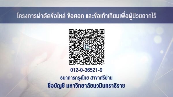 ในการผ่าตัดข้อไหล่ ข้อศอก และข้อเท้าเทียม เพื่อผู้ป่วยยากไร้ จำนวน 66 ข้อ นี้มีค่าใช้จ่ายในการดำเนินโครงการประมาณ 8 ล้านบาท และเมื่อเร็ว ๆ นี้ สำนักงานสลากกินแบ่งรัฐบาล โดยคุณลวรณ แสงสนิท ประธานกรรมการสลากกินแบ่งรัฐบาล ได้มอบเงินบริจาคสนับสนุนโครงการนี้ให้กับโรงพยาบาลวชิรพยาบาล คณะแพทยศาสตร์วชิรพยาบาล มหาวิทยาลัยนวมินทราธิราช เพื่อใช้ในโครงการผ่าตัดข้อไหล่ ข้อศอก และข้อเท้าเทียม เพื่อผู้ป่วยยากไร้ จำนวนเงิน 2,962,855 บาท ซึ่งทางโครงการได้เปิดรับการบริจาคจากผู้มีจิตศรัทธาโดยท่านสามารถนำไปลดหย่อนภาษีได้ 2 เท่า ผ่านทางธนาคารกรุงไทย สาขาศรีย่าน ชื่อบัญชี มหาวิทยาลัยนวมินทราธิราช เลขที่ 012-0-36521-9 หรือที่ QR Code