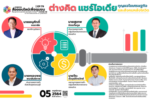 อาจารย์กิติ จารุอารยนันท์ ประธานสถาบันพัฒนาธุรกิจภูมิภาค เปิดเผยว่าสถาบันพัฒนาธุรกิจภูมิภาค โดย มูลนิธิองค์กรเครือข่ายบริการธุรกิจภูมิภาค ได้ออกแบบ และจัดทำรายการสื่อออนไลน์เพื่อชุมชนขึ้น ทุกวันศุกร์ เวลา 18.30 – 20.00 น. เพื่อให้ประชาชนทุกภาคส่วนได้รับรู้ข่าวสาร และแนวทางในการรับมือ แก้ปัญหา เพื่อการดำรงชีวิตอย่างมีความสุข และยั่งยืน โดยในวันที่ 5 พฤศจิกายน 2564 ในประเด็น “คิดต่าง แชร์ไอเดีย กุญแจไขเศรษฐกิจและสังคมหลังโควิด” โดยมีหัวข้อสนทนา – ชวนคุยสถานการณ์เศรษฐกิจและสังคมในช่วงเปิดบ้าน เปิดเมือง เปิดประเทศ กับผลกระทบต่อวิถีชีวิตชุมชน SMEs วิสาหกิจชุมชน อาทิ ประชาชนการ์ดตก สถานประกอบการ สถานที่ท่องเที่ยวไม่ปฏิบัติตามมาตรการป้องกันโรคอย่างเคร่งครัด มีการใช้อินเตอร์ในการทำงาน การซื้อขายสินค้าและบริการเพิ่มขึ้น ธุรกิจการท่องเที่ยวมีแนวโน้มเพิ่มขึ้นบ้าง – แชร์ไอเดีย กลุ่มธุรกิจอะไรที่จะฟื้นตัวได้เร็ว และกลุ่มธุรกิจไหนจะฟื้นตัวได้ช้า อย่างธุรกิจภาคบริการต้องปรับตัวอย่างไร? (โรงแรม รีสอร์ท โรงงาน ร้านค้า ร้านอาหารร้านกาแฟ ร้านสะดวกซื้อ ตลาด ตลาดนัดชุมชนห้างสรรพสินค้า ร้านนวด ฟิตเนส สนามกีฬา แหล่งท่องเที่ยว ฯลฯ)