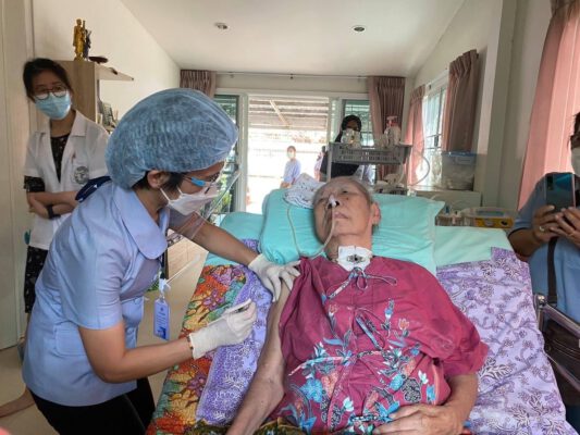 ซึ่งผู้สูงอายุที่ป่วยนอนติดเตียง รายแรกที่ได้รับการฉีดวัคซีนในพื้นที่จังหวัดนครปฐมคือนางสาวปิยธิดา สินเพียร อายุ 57 ปี และ นางสำเนาว์ น้อยหมื่นไวย์ อายุ 76 ปี เลขที่449/36 ถนนพิพิธประสาท ตำบลพระปฐมเจดีย์ อำเภอเมืองนครปฐม โดยทั้งนายกเทศมนตรีนครนครปฐม และสมาชิกสภาผู้แทนราษฎรจังหวัดนครปฐม เขต 1พร้อมคณะบุคคลากรทางการแพทย์ ได้มีการตรวจอาการเบื้องต้นและมีทีมเฝ้าสังเกตการณ์หลังการรับการฉีกวัคซีนพร้อมให้ความรู้เบื้องต้นกับญาติเพื่อคอยดูแลโดยมี อสม.ในพื้นที่ร่วมการติดตามข้อมูลเพื่อรายงานสถานการณ์ต่อหน่วยงานด้วย