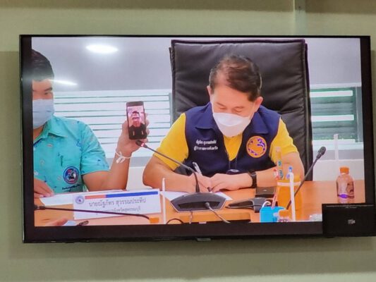 ด้าน รมว.ทส.ซึ่งอยู่ในระหว่างการไปราชการต่างประเทศ ที่สก๊อตแลนด์ สหราชอาณาจักร ได้ร่วมประชุมผ่านแอพพลิเคชั้นไลน์ พร้อมกล่าวว่า ขณะนี้ รู้สึกเป็นห่วงพื้นที่ อ.บางปลาม้าและอ.สองพี่น้องที่ได้รับผลกระทบมาก จึงอยากฝาก อบจ.ให้ดำเนินการช่วยเหลือบรรเทาความเดือดร้อนประชาชนอย่างเต็มที่ และขอบคุณ การทุ่มเทเข้าช่วยเหลือประชาชนของทุกฝ่าย อย่างไรก็ตาม ขอให้เร่งช่วยเหลือประชาชน. ทั้งสุขาลอยน้ำ ทั้งขยะ ขอให้ร่วมกันดูแล และขอให้เตรียมการเยียวยาประชาชนหลังน้ำลดไว้ด้วย อาทิ เงินเยียวยา การซ่อมแซมบ้าน เป็นต้น