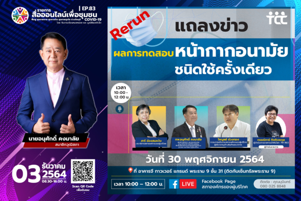 อาจารย์กิติ จารุอารยนันท์ ประธานสถาบันพัฒนาธุรกิจภูมิภาค เปิดเผยว่าสถาบันพัฒนาธุรกิจภูมิภาค โดย มูลนิธิองค์กรเครือข่ายบริการธุรกิจภูมิภาค ได้ออกแบบ และจัดทำรายการสื่อออนไลน์เพื่อชุมชนขึ้น ทุกวันศุกร์ เวลา 18.30 – 20.00 น. เพื่อให้ประชาชนทุกภาคส่วนได้รับรู้ข่าวสาร และแนวทางในการรับมือ แก้ปัญหา เพื่อการดำรงชีวิตอย่างมีความสุข และยั่งยืน โดยในวันที่ 3 ธันวาคม 2564 ในประเด็นน่าสนใจ “แถลงผลการทดสอบ ‘หน้ากากอนามัย ชนิดใช้ครั้งเดียว” (Rerun) ซึ่งแถลงผลทดสอบ โดย