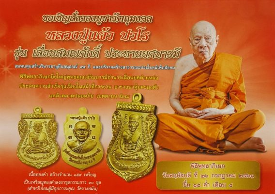 โดย หลวงปู่แผ้ว ปวโร และ พระสมศักดิ์ อินโท (หลวงพี่โกร๋น) เจ้าอาวาสวัดรางหมัน ได้มีเมตตา มอบเหรียญหลวงปู่แผ้ว ปวโร รุ่น “เลื่อนสมณศักดิ์ ประทานยศบารมี”ให้กับตำรวจภูธรภาค 7 เหรียญเนื้อทองคำ จำนวน 159 เหรียญ เป็นเหรียญทองคำลงยาชุดกรรมการ30ชุด(เหรียญละ100,000บาท) เหรียญเนื้อนาค จำนวน 95 เหรียญ(เหรียญละ50,000บาท) เหรียญเนื้อเงินจำนวน 3,995 เหรียญ(เหรียญละ3,000บาท) เหรียญทองแดงรมดำจำนวน 34,995 เหรียญ(เหรียญละ500บาท) และ เหรียญเนื้อฝาบาตรจำนวน 2,995 เหรียญ(แจกทาน) โดยเหรียญหลวงปู่แผ้ว ปวโร รุ่น “เลื่อนสมณศักดิ์ ประทานยศบารมี” ทุกเหรียญจะตอกโค๊ตเป็นรูปเจดีย์ มีรันนิ่งนัมเบอร์ทุกเหรียญ และจะมีพิธีพุทธาภิเษกโดยหลวงปู่แผ้ว ปวโร ในเย็นวันพฤหัสบดีที่ 26 กรกฎาคม 2561 นี้ ณ วิหารวัดประชาราษฎร์บำรุง(วัดรางหมัน)ตำบลรางพิกุล อำเภอกำแพงแสน จังหวัดนครปฐม นักนิยม นักสะสมพระเครื่อง พระบูชา ทั่วประเทศ สนใจจะเช้าเก็บไว้เป็นมงคลและที่ระลึก ติดต่อสอบถามสั่งจองได้ที่ วัดประชาราษฎร์บำรุง(วัดรางหมัน)ตำบลรางพิกุล อำเภอกำแพงแสน จังหวัดนครปฐม