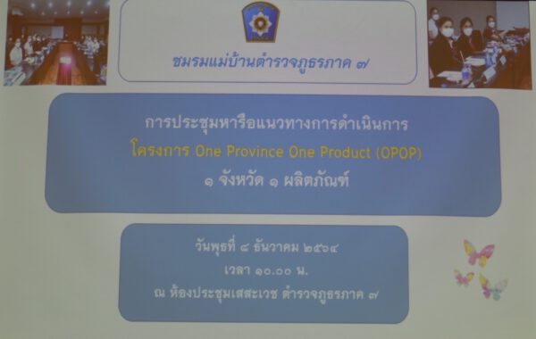 วันวันพุธ ที่ 8 ธันวาคม 2564 เวลา 10.00 น. คุณนภัสนันท์ วุฒิจรัสธำรงค์ ประธานชมรมแม่บ้านตำรวจภูธรภาค 7 เป็นประธาน “การประชุมหารือแนวทางการดำเนินการ โครงการ One Province One Product (OPOP) 1 จังหวัด 1 ผลิตภัณฑ์”