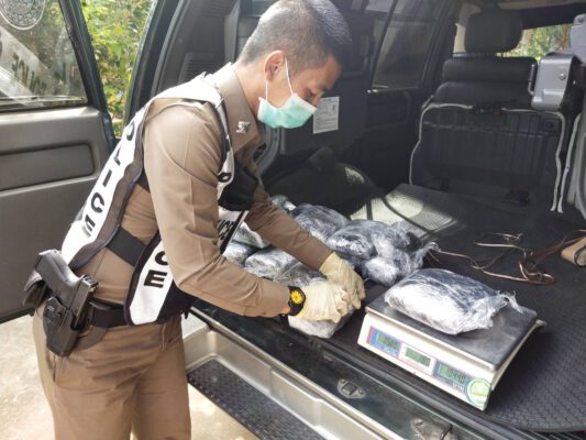 ทั้งนี้พฤติการณ์กำลังในชุด ได้รับแจ้งจากสายลับว่าจะมีการลำเลียงยาเสพติด โดยใช้รถยนต์ รถยนต์ส่วนบุคคลยี่ห้อ ISUZU รุ่น Trooper สีเขียว น้ำตาล หมายเลขทะเบียนภย 2435 กรุงเทพมหานคร เพื่อนำส่งพื้นที่ ต่อมา วันที่ 9 ธ.ค.64 เวลาประมาณ 11.30 น. รถยนต์คันดังกล่าว ได้ขับขี่ผ่านด่านตรวจสามแยกทองผาภูมิ เจ้าหน้าที่จึงได้จัดกำลังติดตาม และได้วางกำลังเพื่อ รอสกัดรถยนต์คันดังกล่าว บริเวณที่ทำการสายตรวจตำบลปรังกาสี ต่อมาชุดจับกุม พบรถยนต์ คันดังกล่าวผ่านมาบริเวณที่ทำการสายตรวจตำบลปรังกาสี จึงแสดงตัวเป็นเจ้าพนักงาน เรียกให้หยุด เพื่อทำการตรวจสอบและตรวจค้น พบนายสมบัติ อ้วนเส้ง (ทราบชื่อภายหลัง) เป็นผู้ขับขี่ และ น.ส.ชญาพัณศรีสุขใส (นั่งข้างคนขับ) จึงขอทำการตรวจค้น ผลการตรวจค้นพบ ยาเสพติดให้โทษประเภท 1 (ยาไอซ์) 13 ห่อ น้ำหนักประมาณ 10 กิโลกรัม ซุกซ่อนอยู่ในช่องเก็บของใต้แบะนั่งแถวหลัง จึงร่วมกันตรวจยึดไว้ จากนั้นได้นำผู้ต้องหาพร้อมของกลางส่งพนักงานสอบสวน สภ.ทองผาภูมิ ดำเนินคดีต่อไป จากนั้นได้นำตัวผู้ต้องหาพร้อมของกลางส่งพนักงานสอบสวนดำเนินคดีตามกฎหมาย ผู้สื่อข่าวรายงานว่า จากการขยายผลผู้ถูกจับได้เปิดเผยข้อมูลถึงเส้นทางยาเสพติดแก่ชุดจับกุมเพื่อขยายผลจับกุมต่อไป