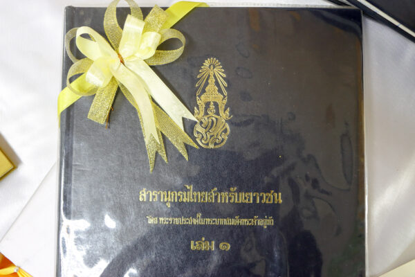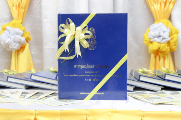 ในการนี้เข้ารับมอบหนังสือพระราชทาน สารานุกรมไทยสำหรับเยาวชนฯ เล่ม 42 เบื้องหน้าพระบรมฉายาลักษณ์พระบาทสมเด็จพระเจ้าอยู่หัวอย่างพร้อมเพรียงกัน สำหรับโครงการสารานุกรมไทยสำหรับเยาวชน โดยพระราชประสงค์ในพระบาทสมเด็จพระบรมชนกาธิเบศร มหาภูมิพลอดุลยเดชมหาราช บรมนาถบพิตร เป็นหนังสือสารานุกรมที่พิมพ์ขึ้นครั้งแรกในปี พ.ศ. 2516 จนถึงปัจจุบัน รวม 42 เล่ม เป็นสารานุกรมภาษาไทยจัดทำขึ้นเป็นรูปเล่ม โดยมีเนื้อหาบางส่วนเผยแพร่ในระบบออนไลน์ เป็นสารานุกรมไทยแบบเป็นชุด เน้นความรู้ที่เกิดขึ้นและใช้อยู่ในประเทศไทย จัดทำโดยคนไทย เพื่อให้คนไทยทุกเพศทุกวัยมีโอกาสได้อ่าน แต่ละเล่มรวบรวมเนื้อเรื่องจากหลากหลายสาขาวิชา เนื้อหาของเรื่องต่าง ๆ เรียบเรียงให้เหมาะสมกับ 3 ระดับความรู้ ให้แก่ เด็กรุ่นเล็ก เด็กรุ่นกลาง และเด็กรุ่นใหญ่ รวมทั้งผู้ใหญ่ที่สนใจทั่วไป แต่ละเรื่องเริ่มต้นด้วยเนื้อหาของระดับเด็กรุ่นเล็ก ตามลำดับ