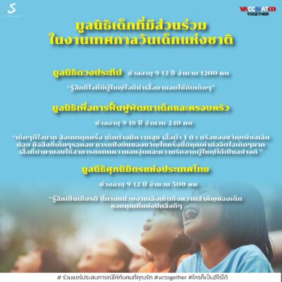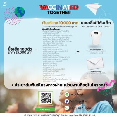 เนื่องในวาระวันเด็กเเห่งชาติ โครงการ Vaccinated Together จึงขอเชิญชวนผู้ที่มีจิตศรัทธาซื้อเสื้อให้น้องๆที่ขาดโอกาสในมูลนิธิเด็กต่างๆ ในวิกฤต COVID-19 เพื่อสร้างขวัญเเละกำลังใจให้น้องๆได้มีกำลังใจในการสู้ต่อไปเเละพร้อมใจกันฉีดวัคซีนเพื่อสร้างภูมิคุ้มกันให้กับเด็กๆ เเละ ความปลอดภัยของเยาวชนในสังคม