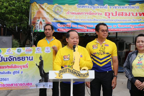 วันที่ 9 กรกฎาคม พ.ศ.2561 เวลา 06.30 น. ณ บริเวณด้านหน้าพระร่วงโรจนฤทธิ์ องค์พระปฐมเจดีย์ นายแพทย์ชัยพร สุชาติสุนทร นายแพทย์สาธารณสุขจังหวัดนครปฐม เป็นประธานกล่าวเปิดกิจกรรมโครงการ 6 x 4 รวมใจ ปั่น ปลุก ลุก สร้างกระแสรณรงค์โครงการ 3 ล้าน 3 ปี เลิกบุหรี่ทั่วไทยเทิดไท้องค์ราชัน ปีที่ 3 และนายธนกร ธนกรชวฤทธิ์ ประธานสมาคมหมออนามัยภาคกลาง กล่าวรายงานวัตถุประสงค์