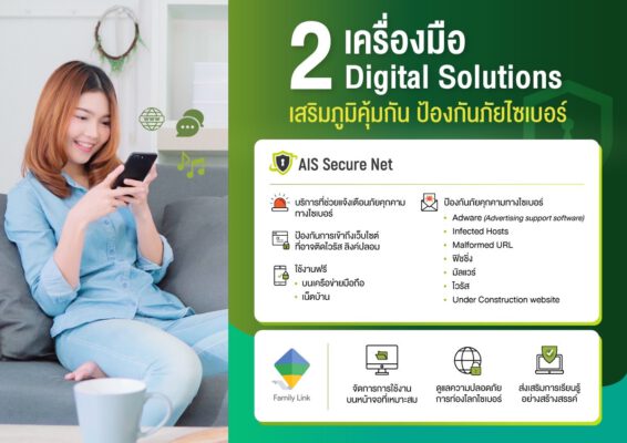 นอกจากนี้ AIS ยังมีเครื่องมือที่เป็นเสมือนกับเกราะป้องกันภัยจากโลกไซเบอร์ที่เปิดให้บริการสำหรับลูกค้าได้ใช้งานฟรีกับ AIS Secure Net บริการที่ช่วยแจ้งเตือนภัยคุกคามทางไซเบอร์ที่มาจากการใช้งานอินเทอร์เน็ตทั้งบนเครือข่ายมือถือและเน็ตบ้านที่วันนี้มีลูกค้าใช้งานแล้วกว่า 142,016 คน ที่สามารถป้องกันภัยคุกคามไซเบอร์จากการใช้งานอินเทอร์เน็ตในรูปแบบต่างๆ ไม่ว่าจะเป็น สแปม ฟิชชิ่ง ไวรัสต่างๆ ควบคู่ไปกับการทำงานร่วมกับพาร์ทเนอร์กับบริการ Google Family Link สำหรับลูกค้าทุกเครือข่าย ที่สามารถดูแลการใช้งานโทรศัพท์มือถือของบุตรหลานให้อยู่บนความปลอดภัยและสร้างสรรค์”