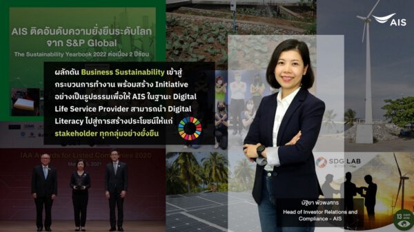 นัฐิยา พัวพงศกร หัวหน้าฝ่ายงานนักลงทุนสัมพันธ์และกำกับดูแลการปฏิบัติงาน AISมองว่า “ในฐานะที่ทำงานด้านนโยบายภาพรวมด้านความยั่งยืนที่เกี่ยวข้องกับStakeholder ทั้งภายในและภายนอกองค์กร เพื่อผลักดันทิศทางของบริษัทให้เกิดการเติบโตอย่างยั่งยืน การทำงานร่วมกับหลายหน่วยงานและหลากกลุ่มบุคคลต้องบริหารความเข้าใจของทุกฝ่าย เพื่อสร้างสมดุลระหว่างคนทำงานและทิศทางของบริษัท เป้าหมายด้านความยั่งยืนในแต่ละด้านไม่ว่าจะเป็นการพัฒนานวัตกรรมและเศรษฐกิจดิจิทัล การสนับสนุนให้สังคมเข้าถึงเทคโนโลยีอย่างเท่าเทียม และการยืนหยัดเพื่อส่งเสริมสิ่งแวดล้อม ล้วนต้องอาศัยความเข้าใจในบริบทและมุมมองของแต่ละStakeholder ที่ย่อมมีความแตกต่าง ความเห็นต่างซึ่งเป็นธรรมชาติ แต่ทำอย่างไรให้สอดประสานร่วมสู่เป้าหมายเดียวกันได้ สิ่งสำคัญคือเน้นการพูดคุยด้วยทัศนคติที่เปิดกว้าง ทำความเข้าใจในความต่างและสร้างความชัดเจนของเป้าหมายร่วม ทำให้ทุกฝ่ายพร้อมใจสนับสนุนเพื่อผลักดันภารกิจด้านความยั่งยืนให้ได้ตามเป้าหมาย”