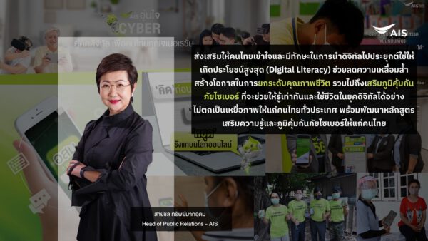 ในขณะที่ สายชล ทรัพย์มากอุดม หัวหน้าฝ่ายงานประชาสัมพันธ์ AIS ที่ดูแลงานด้านสังคม ชุมชนสัมพันธ์ และการสร้างโอกาส การเข้าถึงดิจิทัลเทคโนโลยีให้กับคนไทยอธิบายเสริมว่า “บทบาทของผู้หญิงวันนี้ไม่ได้แตกต่างจากผู้ชายเพราะทุกคนสามารถสร้างสรรค์ผลงานในแบบฉบับของตัวเองได้ แต่ความท้าทายของการทำงานวันนี้คือเมื่อเรื่องเพศไม่มีผล เราจะทำอย่างไรให้ทุกคนสามารถเข้าถึงดิจิทัลและสามารถนำไปใช้ให้เกิดประโยชน์สูงสุด และให้คนไทยมีทักษะด้านดิจิทัลที่ต้องรู้เท่าทันภัยไซเบอร์รูปแบบต่างๆ ซึ่งถือเป็นการทำงานเชิงรุก เพื่อเชื่อมต่อภาคสังคม ชุมชน และประชาชน กับนโยบายของภาครัฐ โดยได้รับการสนับสนุนอย่างเต็มที่จากพนักงานทุกเพศ ทุกวัยพร้อมผู้บริหาร ทุกท่าน ซึ่งแน่นอนว่า จะทำให้การสร้างทักษะด้าน Digital ให้แก่คนไทยสามารถขยายผลในวงกว้าง และสร้างทักษะ พร้อมภูมิคุ้มกันทางไซเบอร์ได้อย่างมีประสิทธิภาพแน่นอน”