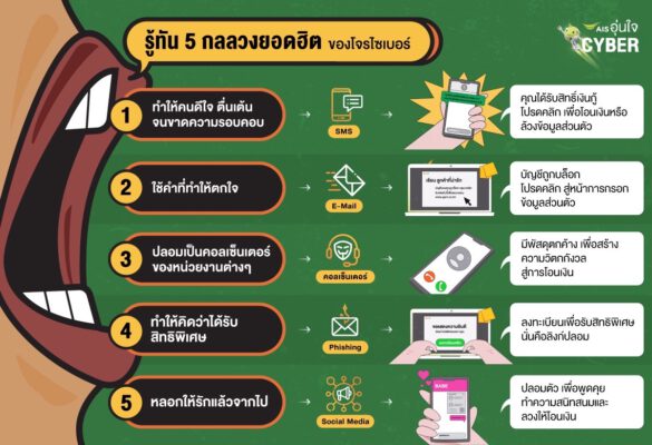 แน่นอนว่า AIS อุ่นใจCyber ไม่มองข้ามในประเด็นนี้ เพราะเราเชื่อว่าหนึ่งในวิธีการรับมือกับภัยไซเบอร์ทุกรูปแบบ คือการมีภูมิคุ้มกันที่ดีเพื่อให้เราตระหนักรู้ และเข้าใจการใช้ออนไลน์อย่างถูกวิธี โดยเฉพาะอย่างยิ่งใน 5 เรื่องที่เป็นคำหลอกลวงยอดฮิตของกลุ่มมิจฉาชีพที่ทุกคนต้องรู้เท่าทัน ไม่ตกเป็นเหยื่อของผู้ไม่หวังดีจากคำโกหกทุกรูปแบบในทุกช่องทาง