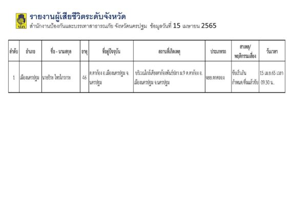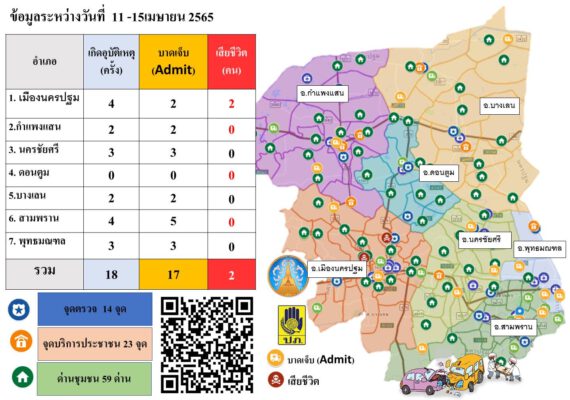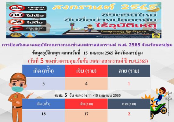 ซึ่งศูนย์อำนวยการความปลอดภัยทางถนนจังหวัดนครปฐม ได้สรุปรายงานสถิติการเกิดอุบัติเหตุทางถนนในพื้นที่ ช่วงควบคุมเข้มข้น 7 วัน เทศกาลสงกรานต์ ปี พ.ศ. 2565 (วันที่ 11-17 เมษายน 2565)