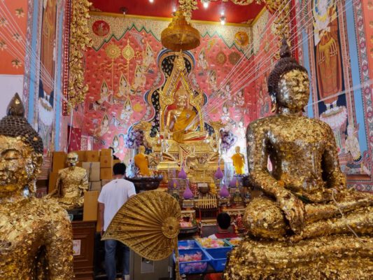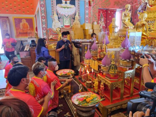 โดยที่ลานหน้าบริเวณท้าวเวสสุวรรณโชคดี และท้าวเวสสุวรรณปลดหนี้ มีกระถางธูปใหญ่ บรรดานักเสี่ยงโชคที่มากราบไหว้ขอพร ร่วมพิธีบวงสรวง ต่างยืนรอลุ้นเลขหางประทัด ปรากฏได้เลข 86-715 ก่อนที่ชาวบ้านต่างพาเดินไปที่แผงหวยในวัด หาซื้อสลากไว้เสี่ยงโชควันที่ 1 พ.ค. 65