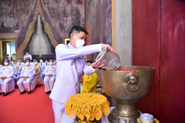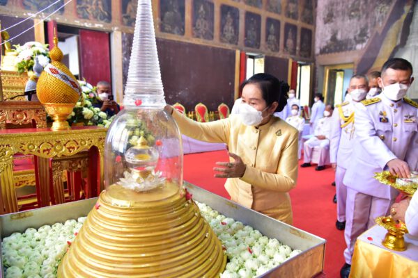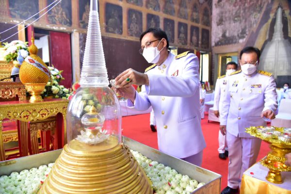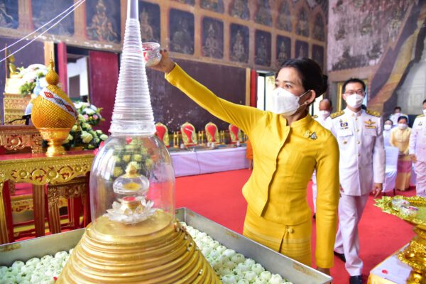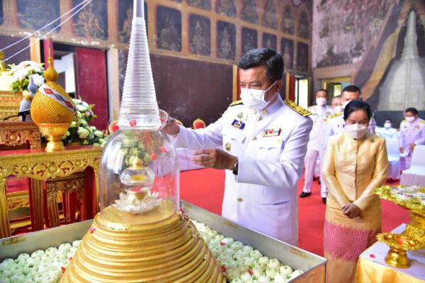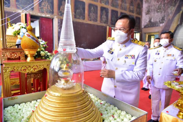 วันที่ 25 เมษายน 2565 ณ พระวิหารหลวง องค์พระปฐมเจดีย์ อำเภอเมือง จังหวัดนครปฐม พระบาทสมเด็จพระเจ้าอยู่หัว ทรงพระกรุณาโปรดเกล้าโปรดกระหม่อมให้กระทรวงมหาดไทย โดยจังหวัดนครปฐมเชิญเครื่องราชสักการะ ซึ่งพระราชทานอุทิศถวายเป็นพุทธบูชา พิธีสรงน้ำพระบรมสารีริกธาตุ ในการพระราชพิธีสงกรานต์พุทธศักราช 2565 ให้แก่วัดพระปฐมเจดีย์ ราชวรมหาวิหาร จังหวัดนครปฐม โดยนายสุรศักดิ์ เจริญศิริโชติ ผู้ว่าราชการจังหวัดนครปฐม เป็นประธาน จุดธูป เทียน บูชาพระรัตนตรัย เปิดกรวยกระทงดอกไม้ ธูปเทียนแพ ถวายราชสักการะ หน้าพระบรมฉายาลักษณ์พระบาทสมเด็จพระเจ้าอยู่หัว จากนั้นจุดธูป เทียน เครื่องราชสักการะ ที่พระราชอุทิศถวายในการพระราชพิธีสงกรานต์ ต่อจากนั้นนำน้ำพระราชพิธีเทลงใส่ขันสาคร แล้วสรงน้ำพระบรมสารีริกธาตุ พระสงเจริญชัยมงคลคาถา หลังจากนั้นถวายธูปเทียนพระราชทาน แด่พระสงฆ์ โดยมีรองผู้ว่าราชการจังหวัด นายกเหล่ากาชาดจังหวัดหัวหน้าส่วนราชการ ข้าราชการ เข้าร่วมพิธีในครั้งนี้