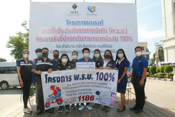 เมื่อเวลา 09.00 น.วันที่ 16 มิ.ย.65 ที่บริเวณลานหน้าศาลากลางจังหวัดประจวบคีรีขันธ์ นายเสถียร เจริญเหรียญ ผู้ว่าราชการจังหวัดประจวบคีรีขันธ์ เป็นประธานพิธีเปิดโครงการรณรงค์การทำประกันภัยรถภาคบังคับ (พ.ร.บ.) และการขับขี่ปลอดภัยสวมหมวกนิรภัย 100% โดยมี นางสาวสุชาดา เหล่างาม ผู้อำนวยการสำนักงานคณะกรรมการกำกับและส่งเสริมการประกอบธุรกิจประกันภัย (คปภ.)จ.ประจวบฯ กล่าวรายงาน มี นางจันทิมา มีโส ผู้อำนวยการภาค สำนักงาน คปภ.ภาค 7 นครปฐม พ.ต.อ.สุธี วรรณสูตร ผกก.สภ.เมืองประจวบฯ นางฐิรัตทียา สุภาชัย ประชาสัมพันธ์จังหวัด นายสามารถ เอี่ยมวงษ์ ผอ.สำนักงาน ธ.ก.ส.จังหวัดประจวบฯ น.ส.ทัตชญา ดำรงวัชระกล ผอ.คปภ.จ.เพชรบุรี นางสุธิรา ปรียวาณิชย์ ผจก.บ.กลางคุ้มครองผู้ประสบภัยจากรถ หัวหน้าส่วนราชการ ผู้แทนหน่วยงาน ชมรมประกันวินาศภัย จ.ประจวบฯ เจ้าหน้าที่ สำนักงาน คปภ. นักเรียน นักศึกษา และประชาชน เข้าร่วม