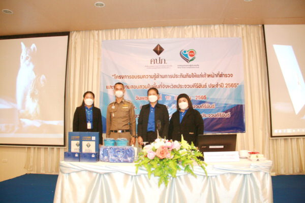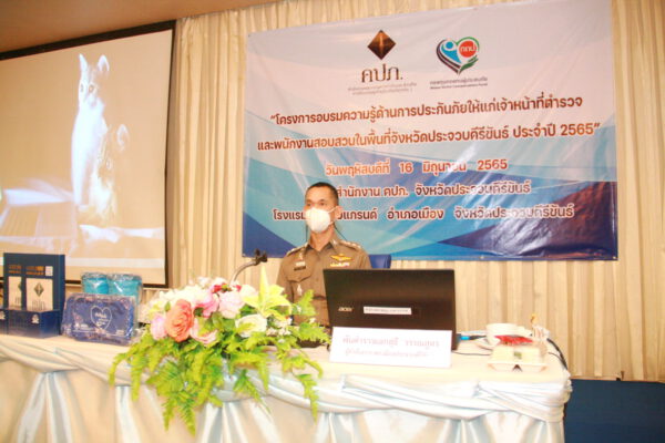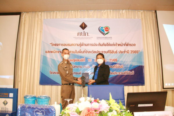เมื่อเวลา 10.00 น.วันที่ 16 มิ.ย.65 ที่ห้องประชุมสิงขร โรงแรมประจวบแกรนด์ อ.เมือง จ.ประจวบคีรีขันธ์ พ.ต.อ.สุธี วรรณสูตร ผกก.สภ.เมืองประจวบคีรีขันธ์ เป็นประธานเปิดโครงการอบรมความรู้ด้านการประกันภัย ให้แก่ เจ้าหน้าที่ตำรวจ และพนักงานสอบสวน ในพื้นที่ตำรวจภูธรจังหวัดประจวบฯ โดยมี นางสาวสุชาดา เหล่างาม ผู้อำนวยการสำนักงานคณะกรรมการกำกับและส่งเสริมการประกอบธุรกิจประกันภัย (คปภ.) จ.ประจวบฯ กล่าวรายงาน มี นางจันทิมา มีโส ผู้อำนวยการภาค สำนักงาน คปภ.ภาค 7จ.นครปฐม น.ส.ทัตชญา ดำรงวัชระกล ผอ.คปภ.จ.เพชรบุรี นางสุธิรา ปรียวาณิชย์ ผจก.บ.กลางคุ้มครองผู้ประสบภัยจากรถ น.ส.ศิราภรณ์ พุ่มแสวง ผจก.สาขา บมจ.คุ้มภัยโตเกียวประกันภัย สาขาประจวบฯ เจ้าหน้าที่สำนักงาน คปภ. เจ้าหน้าที่ตำรวจ พนักงานสอบสวนในแต่ละสถานีตำรวจภูธร ของ ภ.จว.ประจวบฯ เข้าร่วม