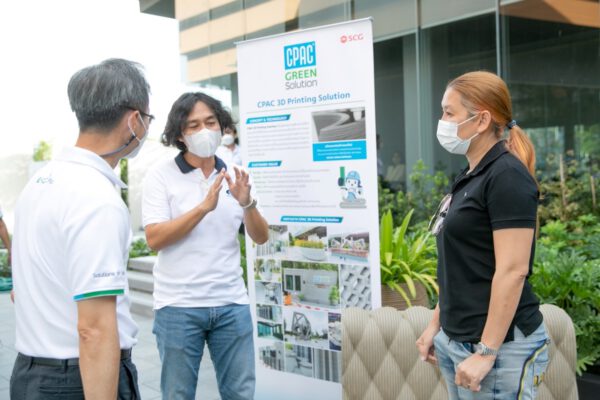 1) CPAC 3D Printing Solution โซลูชันการก่อสร้างรูปแบบใหม่โดยเครื่องพิมพ์แบบ3 มิติ ขึ้นรูปด้วยปูนซีเมนต์เป็นรูปผนังอาคาร หรือชิ้นส่วนของอาคาร ตลอดจนชิ้นงานสำหรับตกแต่ง โดยสามารถทำการพิมพ์ขึ้นรูปทั้งแบบในพื้นที่ก่อสร้างเลย (on-site) และแบบผลิตจากโรงงาน (off-site) ช่วยลดการเกิดของเสียจากกระบวนการก่อสร้างลงอย่างน้อย 70% เมื่อเปรียบเทียบกับระบบหล่อในที่