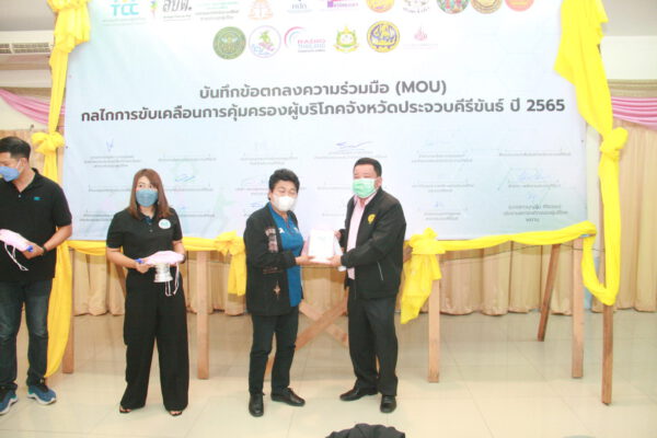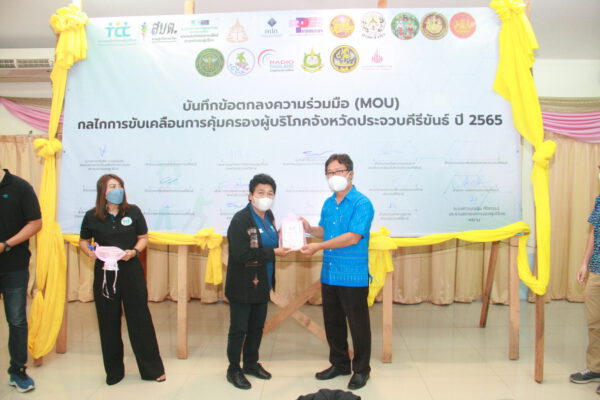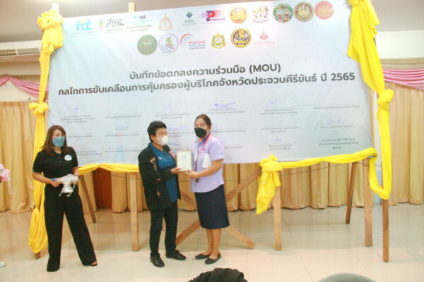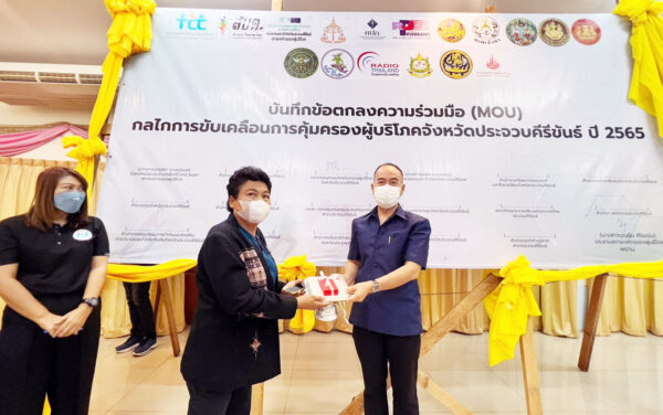 เมื่อเวลา 11.00 น. วันที่ 26 ก.ค.2565 ที่ห้องประชุมเกาะหลักรีสอร์ท อ.เมือง จ.ประจวบคีรีขันธ์ นางสาวบุญยืน ศิริธรรม ประธานสภาองค์กรของผู้บริโภค ได้เป็นประธานกล่าวเปิดและเป็นพยาน ในพิธีลงนามบันทึกข้อตกลงความร่วมมือ (MOU) กลไกขับเคลื่อนการคุ้มครองผู้บริโภคจังหวัดประจวบคีรีขันธ์ ระหว่าง หน่วยงานประจำจังหวัดประจวบคีรีขันธ์ สภาองค์กรของผู้บริโภค หน่วยประจำเขตพื้นที่ภาคตะวันตก สภาองค์กรของผู้บริโภค กับ ภาคีหน่วยงานภาครัฐในพื้นที่จังหวัดประจวบฯ ที่เกี่ยวข้องกับงานด้านคุ้มครองผู้บริโภค โดยมี นายคมกริช เจริญพัฒนสมบัติ รองผู้ว่าราชการจังหวัดประจวบคีรีขันธ์ เป็นตัวแทน นายเสถียร เจริญเหรียญ ผู้ว่าราชการจังหวัดฯ ซึ่งในฐานะประธานอนุกรรมการคุ้มครองผู้บริโภคจังหวัดประจวบฯ พร้อมส่วนราชการ ตลอดจนหน่วยงานในพื้นที่จังหวัดประจวบฯ ประกอบด้วย สำนักงานขนส่งจังหวัด สำนักงานเจ้าท่าภูมิภาคสาขาประจวบฯ สำนักงานที่ดินจังหวัด สำนักงานโยธาธิการและผังเมืองจังหวัด สำนักงานสาธารณสุขจังหวัด สถานีวิทยุกระจายเสียงแห่งประเทศไทย (สวท.)ประจวบฯ สำนักงานทรัพยากรธรรมชาติและสิ่งแวดล้อมจังหวัด(ทสจ.) สำนักงานพาณิชย์จังหวัด สำนักงานพลังงานจังหวัด และ บริษัทกลางคุ้มครองผู้ประสบภัยจากรถ จำกัด สาขาประจวบฯ