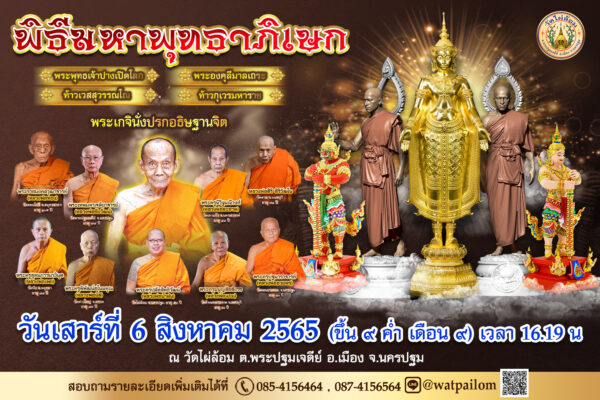 และดังที่ได้เจริญพรไปว่า ในวันเสาร์ที่ 6 สิงหาคม พ.ศ.2565 ขึ้น 9 ค่ำ เดือน 9 วันมหามงคล เป็นวันดีศรีสวัสดิ์ พิธีใหญ่ มหาพุทธาภิเษก พระพุทธเจ้าปางเปิดโลก รูปพระองคุลีมาลเถระ และท้าวเวสสุวรรณ–ท้าวกุเวรมหาราช ก็นับได้ว่ารูปหล่อพระองคุลีมาลนั้นก็ผ่านการตกแต่ง ปิดทองจนงดงาม พร้อมเข้าพิธีพุทธาภิเษกเป็นลำดับต่อไป