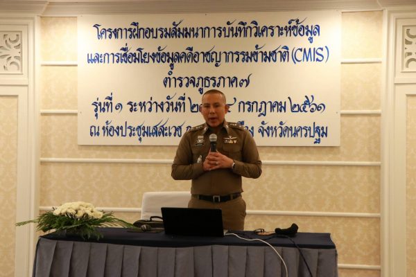 พล.ต.ต.สุพัฒน์ เชยชิด ผบก.อก.ภ.7 กล่าวว่าโครงการ ฝึกอบรมสัมมนาการบันทึกวิเคราะห์ข้อมูล และการเชื่อมโยงข้อมูลคดีอาชญากรรมข้ามชาติ (CMIS) แก่ตำรวจภูธรภาค 7 รุ่นที่ 1 นี้ จัดขึ้นระหว่างวันที่ 23-24 กรกฎาคม 2561 การบันทึกวิเคราะห์ข้อมูล และการเชื่อมโยงข้อมูลคดี อาชญากรรม ข้ามชาติ (CMIS) ตำรวจภูธรภาค 7 ที่ผ่านมา คงได้รับทราบข่าวสารมาโดยตลอดแล้วว่า การก่ออาชญากรรมข้ามชาติ เป็นอาชญากรรมที่ส่งผลกระทบต่อมวลมนุษยชาติจำนวนมาก ตัวอย่างเช่น แก๊งคอลเซ็นเตอร์ ขบวนการค้ายาเสพติด ขบวนการค้าอาวุธสงคราม ตลอดจนการก่อวินาศกรรมของขบวนการต่างๆ ล้วนแล้วมีส่วนสืบเนื่องจากอาชญากรรมข้ามชาติ