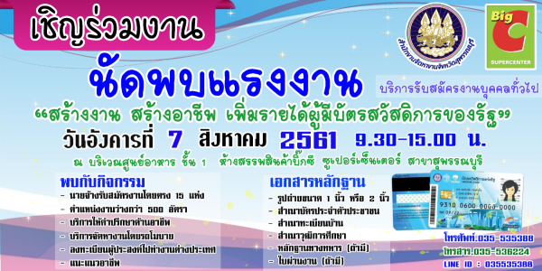 นายโอวาท ทองบ่อมะกรูด จัดหางานจังหวัดสุพรรณบุรี เปิดเผยว่า สำนักงานจัดหางานจังหวัดสุพรรณบุรี จะจัดกิจกรรมนัดพบแรงงาน ซึ่งเป็นหนึ่งกิจกรรมภายใต้โครงการ “เพิ่มศักยภาพผู้มีรายได้น้อยที่ลงทะเบียนสวัสดิการแห่งรัฐ” เพื่อความมั่นคง มั่งคั่งและยั่งยืน อีกทั้งเพิ่มโอกาสการมีงานทำให้กับผู้ว่างงานให้มีงานทำที่ดี มีความมั่นคง และบริการให้กับนายจ้าง/สถานประกอบการ โดยจัดหาสถานที่ให้เป็นจุดนัดพบ สัมภาษณ์งาน ระหว่างนายจ้าง กับผู้ว่างงาน ลดเวลา และค่าใช้จ่ายในการหางานทำ สำหรับกิจกรรมในงาน นอกจากมีบริการรับสมัครงาน และสัมภาษณ์งานกับนายจ้างโดยตรง มากกว่า 15 บริษัท แล้ว ยังมีกิจกรรมอื่น ๆ อาทิ การบริการสมัครงานออนไลน์ผ่านเว็บไซต์ของศูนย์บริการจัดหางานเพื่อคนไทย บริการทดสอบความถนัดทางอาชีพ ซึ่งใช้แบบวัดบุคลิกภาพเพื่อการศึกษาต่อ และการแนะแนวอาชีพ โดยมีรถบริการจัดหางานเคลื่อนที่ ไปให้บริการ รวมถึงคลินิกแรงงาน บริการตอบข้อซักถามด้านแรงงาน จึงขอเชิญชวนมีบัตรสวัสดิการแห่งรัฐ ผู้ว่างงาน ที่ต้องการหางานทำ นายจ้าง/ สถานประกอบการ และประชาชนทั่วไป เข้าร่วมกิจกรรมต่างๆ ในวันอังคาร ที่ 7 สิงหาคม 2561 ณ บริเวณศูนย์อาหาร ชั้น 1 ห้างสรรพสินค้าบิ๊กซี ซูเปอร์ เซ็นเตอร์สาขาสุพรรณบุรี อ.เมือง จ.สุพรรณบุรี ตั้งแต่เวลา 9.00-15.00 น. รับรองว่ามางานนี้มีงานทำแน่นอน เนื่องจากมีตำแหน่งงานว่างรองรับมากกว่า 500 อัตรา