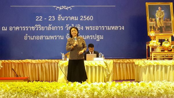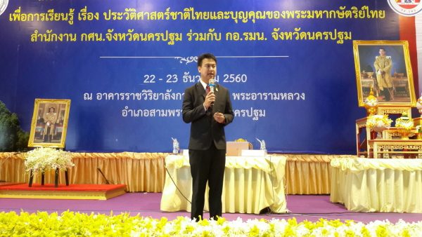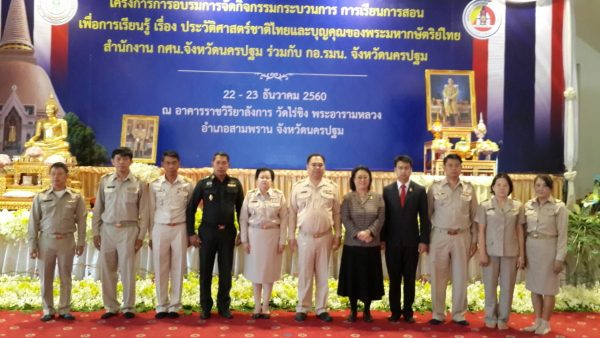 วันที่ 22 ธันวาคม พ.ศ.2560 นางสาวโสมอุษา เลี้ยงถนอม รองเลขาธิการ กศน.เป็นประธานในพิธีเปิดโครงการ การจัดอบรมการจัดกิจกรรมกระบวนการ การเรียนการสอนเพื่อการเรียนรู้เรื่องประวัติศาสตร์ชาติไทยและบุญคุณของพระมหากษัตริย์ไทย โดย ดร.ปรเมศวร์ ศิริรัตน์ ผู้อำนวยการ สำนักงาน กศน.จังหวัดนครปฐม กล่าวรายงาน ซึ่งจัดโครงการร่วมกับ กอ.รมน. จังหวัดนครปฐม ระหว่างวันที่ 22-23 ธันวาคม พ.ศ. 2560 ณ อาคารราชวิริยาลังการ วัดไร่ขิงพระอารามหลวง อำเภอสามพราน จังหวัดนครปฐม โดยมีพันจ่าอากาศโทปกาสิต ตราชื่นต้อง รอง ผู้อำนวยการกศน.จังหวัดนครปฐม ผู้อำนวยการสถานศึกษา ทั้ง 7 อำเภอ ข้าราชการ ครูอาสาสมัครฯ ครูกศน.ตำบล ครูศรช. และนักศึกษา เข้าร่วมอบรม จำนวน 500 คน
