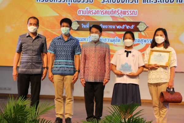 ในพิธีมอบรางวัล “ครอบครัวคุณธรรม” ซึ่งผู้เข้ารับรางวัล ประกอบด้วย ผู้รับรางวัลเกียรติบัตรประกาศเกียรติคุณ “ ครอบครัวคุณธรรม ” ระดับอำเภอ จำนวน ๑๐๐ ครอบคัว ผู้รับรางวัลโล่ประกาศเกียรติคุณ “ ครอบครัวคุณธรรม ” ระดับจังหวัด จำนวน ๑๐ ครอบครัว โดยแต่ละครอบครัวประกอบด้วยนักเรียน บิดา มารดา หรือผู้ปกครอง และผู้บริหารสถานศึกษา หรือครูที่ได้รับมอบหมายของสถานศึกษาที่นักเรียนผู้นั้น กำลังศึกษาอยู่เพื่อเป็นการยกย่องเชิดชูเกียรติแก่ “ ครอบครัวคุณธรรม ” รวมทั้งสิ้น ๑๑๐ ครอบครัว ซึ่งนายณัฐภัทร สุวรรณประทีป ผู้ว่าราชการจังหวัดสุพรรณบุรี เป็นประธานมอบโล่และประกาศเกียรติคุณ