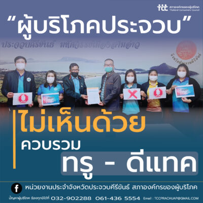 เมื่อเวลา 14.30 น.วันที่ 15 ก.ย.2565 ที่ห้องหว้ากอ ชั้น 2 ศาลากลางจังหวัดประจวบคีรีขันธ์ น.ส.ธนพร บางบัวงาม หัวหน้าหน่วยงานประจำจังหวัดประจวบฯ สภาองค์กรของผู้บริโภค(สอบ.) นายนันทปรีชา คำทอง ประธานสภาองค์กรของผู้บริโภคจังหวัดประจวบฯ พร้อมด้วย เครือข่ายผู้บริโภค เจ้าหน้าที่หน่วยงานประจำจังหวัดฯ ได้ยื่นหนังสือถึงผู้ว่าราชการจังหวัด เพื่อแสดงจุดยืนคัดค้านการควบรวมธุรกิจระหว่าง บริษัท ทรู คอร์ปอเรชั่น จำกัด (มหาชน) และ บริษัท โทเทิ่ล แอ็คเซ็ส คอมมูนิเคชั่น จำกัด (มหาชน) หรือ ดีแทค โดยมี ว่าที่พันตรี อดิศักดิ์ น้อยสุวรรณ รองผู้ว่าราชการจังหวัดประจวบฯ เป็นตัวแทนผู้ว่าฯ มารับหนังสือ