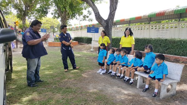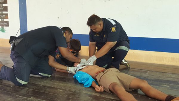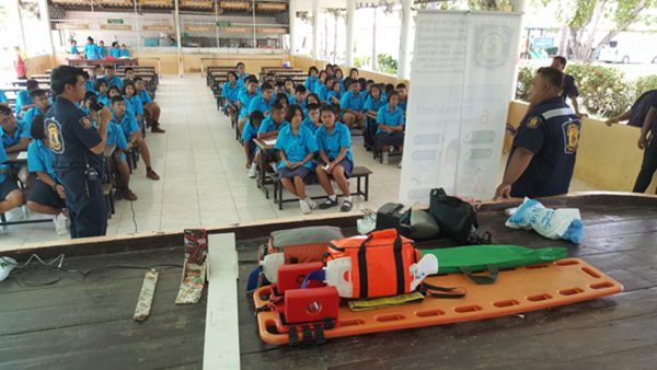 จึง ได้จัดทีมอาสาสมัครมูลนิธิฯ เดินทางไปบรรยายให้ความรู้ ความเข้าใจให้ความรู้แก่เด็กนักเรียนชั้นมัธยมปีที่1-3 อีกกว่า 100 คน กรณีที่พบผู้ป่วย ผู้ประสบอุบัติเหตุต้องทำอย่างไร การบรรยายเริ่มตั้งแต่การสอบถามอาการ การโทรแจ้งเหตุ การปฐมพยาบาลเบื้องต้น และการทำ CPR การปฐมพยาบาลเด็กที่ติดอยู่ในรถแล้วหมดสติว่าจะต้องทำอย่างไร ทั้งนี้เพื่อเป็นการช่วยเหลือชีวิตเบื้องต้นแก่ผู้ที่ประสบอุบัติเหตุ