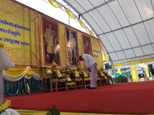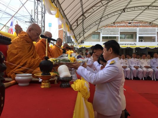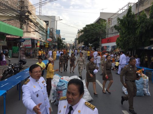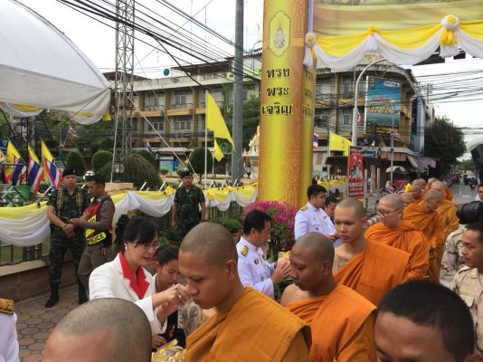 โดยมี ศาล ทหาร ตำรวจ องค์กรปกครองส่วนท้องถิ่น และพสกนิกรทุกหมู่เหล่าราชการ ต่างพร้อมใจกันสวมเสื้อสีเหลืองเฉลิมพระเกียรติเข้าร่วมทำบุญตักบาตรข้าวสารอาหารแห้ง แด่พระภิกษุสงฆ์ สามเณร จำนวน 67 รูป ระยะทางกว่า 1 กิโลเมตร