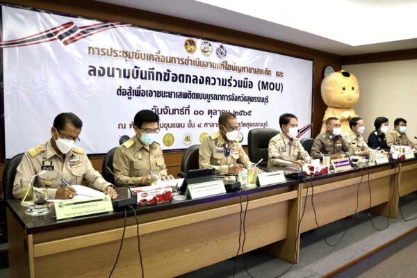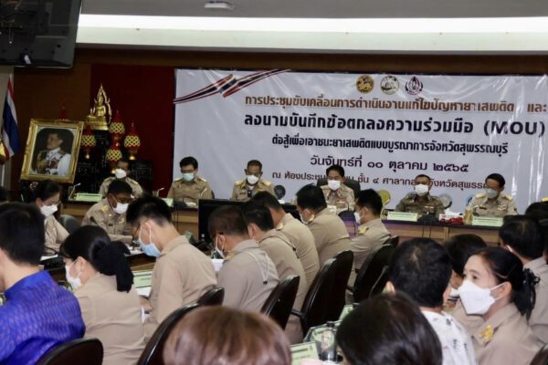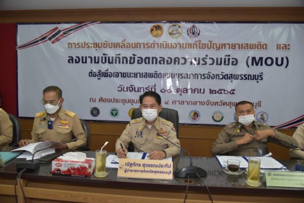 วันนี้(10 ต.ค.65) ที่ห้องประชุมขุนแผน ศาลากลางจังหวัดสุพรรณบุรี นายณัฐภัทร สุวรรณประทีป ผู้ว่าราชการจังหวัดสุพรรณบุรี เป็นประธานการประชุมขับเคลื่อนการดำเนินงานแก้ไขปัญหายาเสพติดแล พิธีลงนามบันทึกข้อตกลงความร่วมมือ (MOU) ต่อสู้เพื่อเอาชนะยาเสพติดแบบบูรณาการจังหวัดสุพรรณบุรี