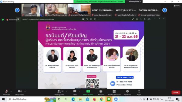 พระเทพวัชรเมธี,ผศ.ดร.อธิการบดีมหาวิทยาลัยมหามกุฏราชวิทยาลัย กล่าวต้อนรับและให้สัมภาษณ์คณะกรรมการประเมินคุณภาพการศึกษาภายในระดับสถาบัน มุ่งสู่ประบวนทัศน์พระพุทธศาสนาในโลกดดิจิทัล ระหว่างวันที่ 21-22 ตุลาคม 2565 รูปแบบออนไลน์ คณะกรรมการประเมินประกอบด้วย รศ.ดร.วศิน อิงคพัฒนากุลรศ.ดร.กาญจนา โชคเหรียญสุขชัย ผศ.ดร.เยาวภา บัวเวช ดร.พิเชษฐ์ มุสิกะโปดก และผศ.ดร.ตะกูล ชำนาญ