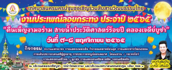 นายเสรินทร์ แก้วพิจิตร นายกเทศมนตรีนครนครปฐม เปิดเผยว่า เทศบาลนครนครปฐมกำหนดจัดงานประเพณีลอยกระทง ประจำปี 2565 “คืนเพ็ญงามอร่าม สายน้ำประวัติศาสตร์ร้อยปี คลองเจดีย์บูชา” ขึ้น ระหว่างวันที่ 7 – 8 พฤศจิกายน 2565 ณ บริเวณคลองเจดีย์บูชา (หน้าวัดพระงาม) และบริเวณเทศบาลนครนครปฐม (เดิม) ถนนเทศา ซอย 1 เพื่อเป็นการส่งเสริมฟื้นฟูอนุรักษ์ไว้ซึ่งขนบธรรมเนียมประเพณีอันดีงามของชาวไทย ที่มีมาแต่โบราณให้คงอยู่สืบต่อไป อีกทั้งเป็นการส่งเสริมการท่องเที่ยวจังหวัดนครปฐม และขอความร่วมมือหน่วยงานต่าง ๆ และประชาชนแต่งผ้าไทยไปลอยกระทง ร่วมกันรณรงค์อนุรักษ์แหล่งน้ำในวันลอยกระทง โดยขอให้ใช้กระทงที่ทำจากวัสดุธรรมชาติ เช่น ใบตอง ก้านกล้วยหรือดอกไม้สดแทนการใช้โฟม ทั้งนี้เพื่อรักษาแม่น้ำ ลำคลองและแหล่งน้ำธรรมชาติไม่ให้เน่าเสีย หรือเป็นพิษ อันเป็นการรักษาสิ่งแวดล้อมในเขตเมืองให้ดียิ่งขึ้น
