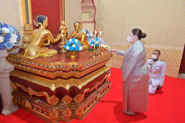 โอกาสนี้ เสด็จขึ้นพระวิหารพระร่วงโรจนฤทธิ์ ทรงวางพวงมาลัย และทรงจุดธูปเทียนเครื่องนมัสการท้ายที่นั่งบูชาพระร่วงโรจนฤทธิ์ และพระพุทธรูปปางประสูติ จากนั้น ทรงวางพวงมาลัย และทรงจุดธูปเทียนเครื่องทองน้อยถวายราชสักการะ พระบรมราชสรีรางคาร พระบาทสมเด็จพระมงกุฎเกล้าเจ้าอยู่หัว และพระสรีรางคาร พระนางเจ้าสุวัทนาพระวรราชเทวี และสมเด็จพระเจ้าภคินีเธอ เจ้าฟ้าเพชรรัตนราชสุดา สิริโสภาพัณณวดีแล้วทรงวางพวงมาลัย ทรงจุดธูปเทียนเครื่องนมัสการท้ายที่นั่งบูชาพระป่าเลไลยก์