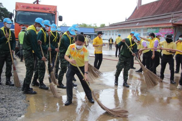 พร้อมกล่าวว่า จังหวัดสุพรรณบุรี เริ่มจะเข้าสู่สภาวะปกติ และประชาชนที่เข้าพักในศูนย์พักพิงชั่วคราวได้เดินทางกลับเข้าบ้านพักอาศัยของตนเองได้แล้ว การจัดกิจกรรมทำความสะอาดศูนย์พักพิงฯ เพื่อเป็นการแสดงความขอบคุณทางวัดรางบัวทองที่อนุญาตให้ทางราชการได้ใช้สถานที่เป็นศูนย์พักพิงชั่วคราว โดยมี หัวหน้าส่วนราชการ ทหาร ตำรวจ อาสาสมัคร ประชาชนจิตอาสา ร่วมกิจกรรม