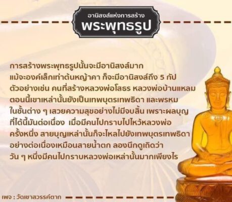 ผู้ใดสร้างรูปพระพุทธเจ้า จะเป็นองค์เล็กเท่าต้นคาก็ดี ใหญ่กว่าต้นคาก็ดีผู้นั้นจะได้เป็นพรหม เป็นอินทร์ หมื่นชาติแสนชาติ ถ้าเป็นมนุษย์จะได้เป็นพระเจ้าจักรพรรดิหมื่นชาติแสนชาติ จะไม่เป็นผู้ตกต่ำเลยตราบจนกว่าเข้าสู่นิพพาน