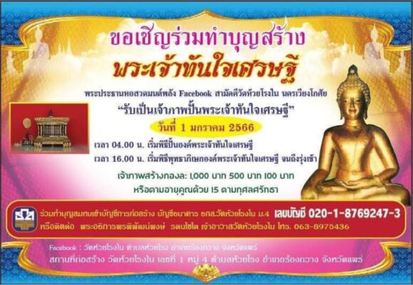 เชิญร่วมบุญใหญ่ปั้นพระเจ้าทันใจ ปั้นสำเร็จภายในวันเดียว ขนาดหน้าตัก 39 นิ้วประดิษฐานหอสวดมนต์พลัง facebook วัดห้วยโรงใน กำหนดปั้น ในวันที่ 1 มกราคม 2566 นี้